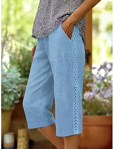 Жен. Искусственный хлопок и лен Брюки-капри Брюки Уличный стиль На каждый день Длина колена Нормальная Сплошной цвет Карман удобный Дышащий Неэластичная Повседневные на открытом воздухе Отпуск