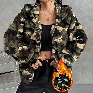 Жен. Двойная пушистая куртка Зимнее пальто Толстые Теплый Застегнуться Длинный рукав Виды спорта камуфляж Верхняя часть Для На открытом воздухе Путешествия Курорт Спортивная одежда