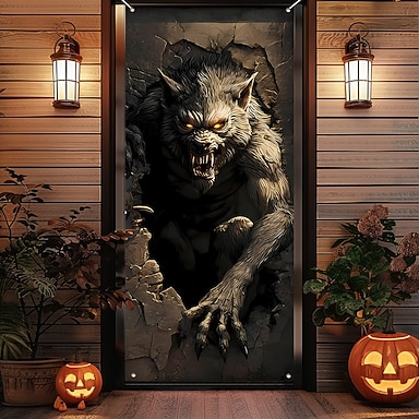 Наружные баннеры на дверь на Хэллоуин, эффект разбития, оборотень, 3D, темный панк, готический стиль, вечеринка, наружная съемка, фоны, входная дверь, украшение крыльца, стена, дверь
