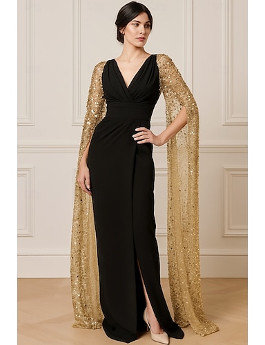 Футляр В пол Выпускные платья Вечернее платье С пышной юбкой Торжественное платье Элегантный стиль Блестящая Высокий раскол Длинный рукав V-образный вырез Официальные Свадьба Карман