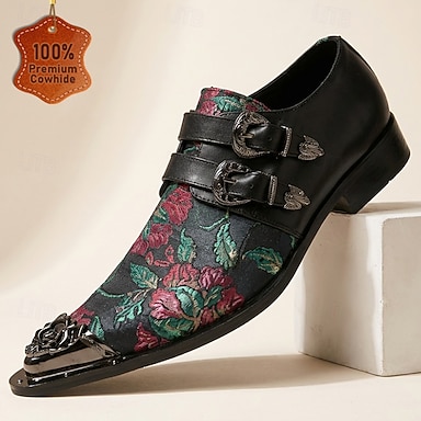 Мужские черные туфли-монки с цветочным принтом, двойной пряжкой, острым носком и металлическим носком. Идеальная обувь для свадеб, банкетов, вечеринок, выпускных балов, модных мероприятий и вечерних выходов.