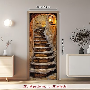 Декоративная накладка на дверь с 3D-оптической иллюзией, имитирующая каменную лестницу, и теплым светом фонаря, 2D-плоская печать.