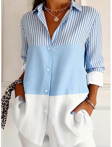 Жен. Рубашка Пуговицы С принтом Графика Полоски Элегантный стиль Стиль На каждый день Длинный рукав Рубашечный воротник Обычные топы Повседневные Уличная одежда Офис Синий Лето Весна Осень