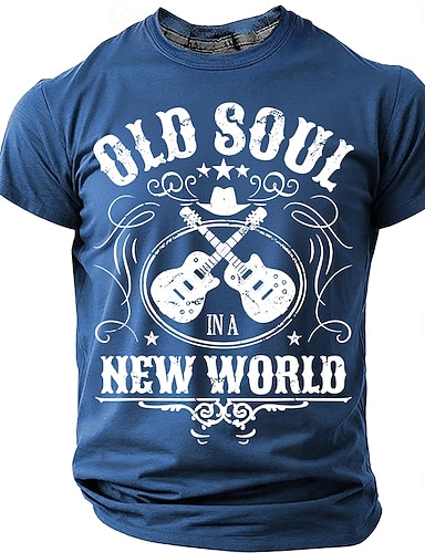 мужская футболка с надписью "Old Soul in a New World", скрещенные гитары, ковбойская шляпа, звезды, винтаж, потертый стиль, кантри, ретро, графический принт, стандартный крой, повседневная,