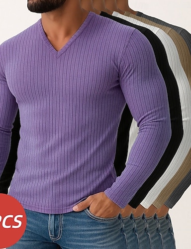 Муж. Футболка Трикотажная футболка в рубчик Рубашка с длинным рукавом Длинный рукав V-образный вырез Весна Осень Зима Полотняное плетение Вертикальные полосы Пит Стрип