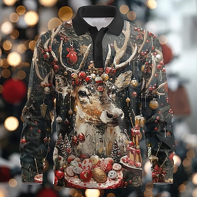 рождество мужское рождественское животное 3d поло rudolph повседневная одежда с длинным рукавом повседневная одежда для отпуска весна осень&зимний воротник с 3D-принтом на пуговицах, черный,