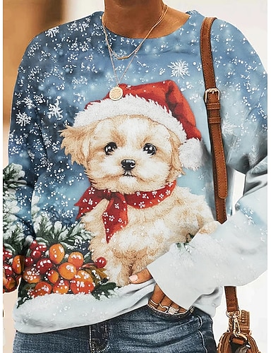 Рождественская женская футболка с графикой винтажная мода стильная длинный рукав круглый вырез обычные топы ежедневный выходной принт белый красный синий весна осень зима
