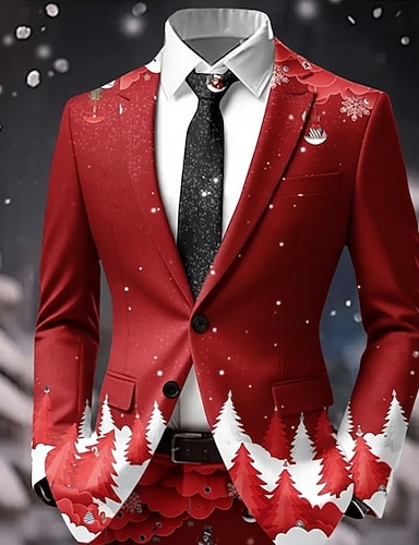 Новогодняя тематика Муж. Новогодняя ёлка Пиджак Удобный Художественный На каждый день Вечерние наряды Повседневные фестиваль Пуговицы С принтом Весна Осень Зима Острый Длинный рукав Красный 1