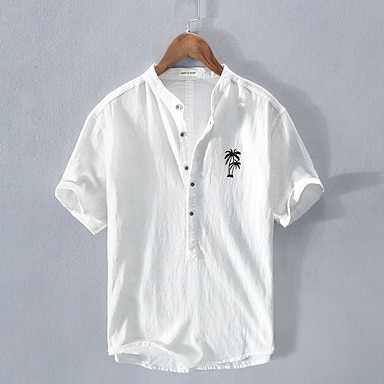 Муж. Рубашка льняная рубашка Хлопково-льняная рубашка Белая хлопковая рубашка Минималистская рубашка Aloha Рубашка с китайским воротником Кокосовая пальма Отпуск Для улицы