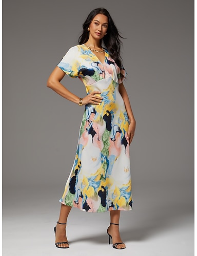 Женское атласное платье макси с абстрактным принтом кисти, подолом «русалка», рукавом «летучая мышь», элегантным повседневным, для отдыха, весны и лета