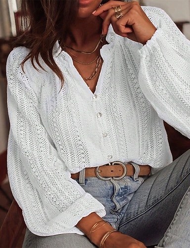 Жен. Рубашка Нарядные Топы Полотняное плетение Элегантный стиль Дамы Стиль Длинный рукав V-образный вырез Обычные топы Офис Повседневные Праздники С отверстиями Пуговицы