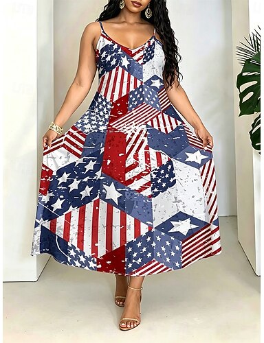 День независимости США Жен. Длинное платье Сарафан Платье A-силуэта Платье-комбинация Отпуск На каждый день Пляж На выход Стандартный Графика Звезды и полосы Без рукавов V-образный вырез
