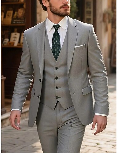 Men's Business Casual Tweed Suits Notch Lapel Black Light Grey Business Formal Solid Colored Tailored Fit 3 Piece Single Breasted Two-buttons