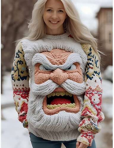 Christmas Women's Sweater Cute Streetwear Casual Graphic Santa Claus Snowflakes Crew Neck Patchwork Knitted Long Sleeve Regular Tops Knit Christmas Party Red Spring Fall