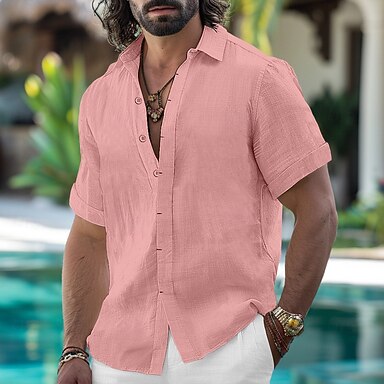 Men's Shirt Linen Shirt Summer Shirt Beach Wear Button Up Shirt Plain Vacation Curise Black White Pink Navy Blue Short Sleeve Collar Summer Spring Clothing Apparel