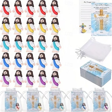 A set of 20 Sunday school Christian church party gifts for Little Jesus includes 20 mini Jesus statues 20 prayer scripture cards and 20 organza bags in multiple colors