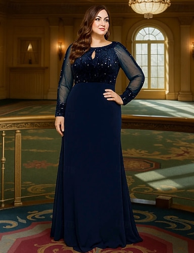 A-Line Floor Length Formal Dress Evening Gown Long Sleeve Crew Neck Elegant Vintage Plus Size Polyester Mother of the Bride Dress with Sequin