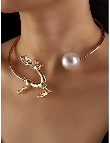 Women's Gold Reindeer Bracelet and Pearl Choker Necklace Set – Festive Jewelry for Women, Elegant Christmas Party Accessories