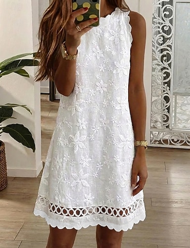 Dam Mini klänning Vit spetsklänning A linjeklänning Ledigt Dagligen Normal Slät Ärmlös V-hals Naggad hals Vit Sommar