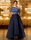 Broderad marinblå blommig kolumnekvällsklänning elegant klänning formell golvlängd ärmlös en axel satin med glittrande slöja(s) rysch