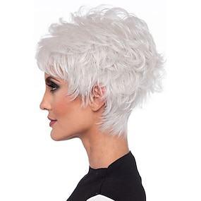 grå lockiga pixie peruker för vita kvinnor kort fluffigt vitt hår med lugg naturlig syntetisk värmebeständig peruk