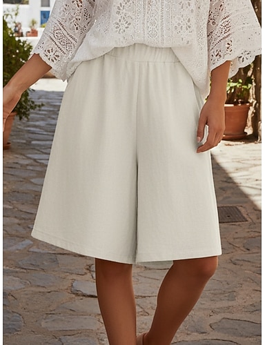 Dam Vanligt Konstbomullslinne Shorts Bermudashorts Ledig / Sportig Kort Medium Midja Slät Ficka Elastisk midja Mjuk Andningsfunktion Oelastisk Helgen Vit Gul Grå Sommar Vår & Höst Lös passning