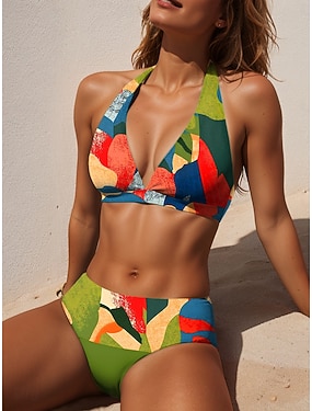 Kvinnors bikini 2-delad baddräkt kaxig halter vintage sexig grafisk geometrisk djupt halsringning ärmlösa baddräkter