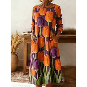 Dam Knälång klänning Vardagsklänning Vintage Ledigt Helgdag Normal Blommig Grafisk Långärmad Rund hals Blå Rubinrött Purpur Grön Sommar Vår