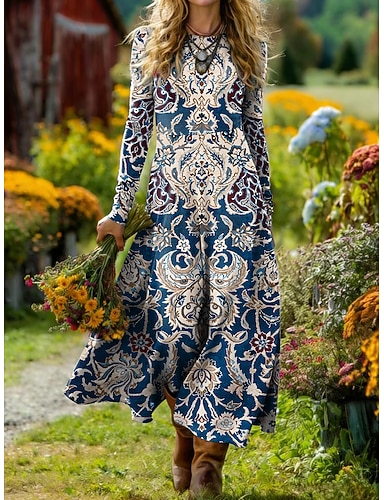 Dam Maxiklänning Fit And Flare Klänning Semester Ledigt Boho Dagligen Fest Utekväll Normal Blommig Grafisk Prickig Långärmad Rund hals Blå Svart Ljusbrun Purpur Höst Vinter