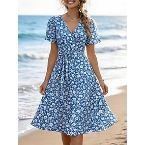 Dam Midiklänning Solklänning A linjeklänning Ledigt Fest Helgdag Normal Blommig Grafisk Kortärmad V-hals Blå Vit Rubinrött Grön Sommar Vår