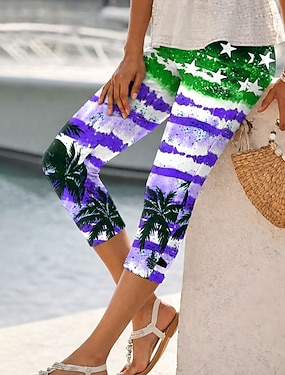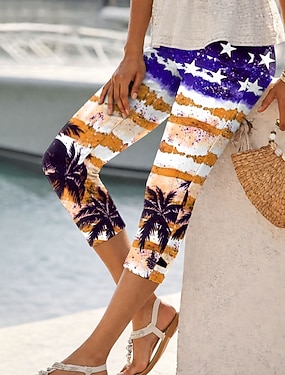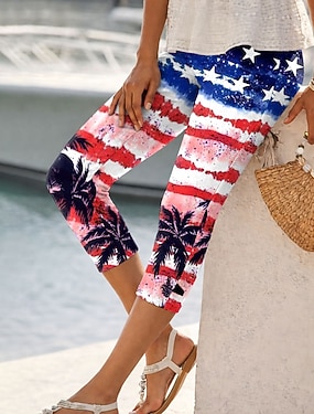 Dam Kinesiska Damasker Semester Mode Streetwear Kapris Hög midjaPantsAmerikanska självständighetsdagen Löv Amerikanska flaggan Komfort Mjuk Bekväm Elastisk Dagligen Utomhus Semester Blå Vit Rubinrött
