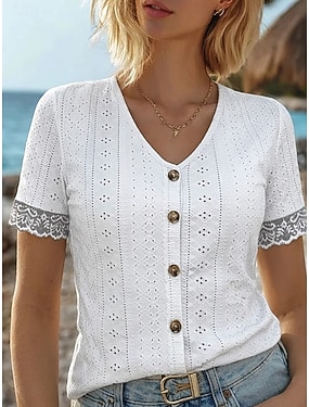 Kvinnors vita eleganta spets toppar ögla blus grundläggande blommig spets tryck kort ärm regelbundna toppar V-hals avslappnad romantisk petite toppar sommar semester kläder vit rosa blå orange grön