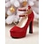 Damklackade platåskor med Mary Jane-motiv i röd sammet, pumps med dubbla remmar och höga klackar för julfester och festkläder &vinterkvällar