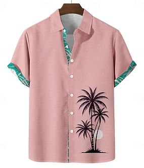 Herr Kokosnötsträd Tropiska växter Hawaii skjorta Knapp upp skjorta Aloha skjorta Kortärmad Hawaiisk Semester Helgdag Standkläder Sommar Vår Nedvikt 3D-utskrift Linne som skjorta Blå Rodnande Rosa
