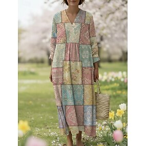 Dam Midiklänning Vardagsklänning Skiftklänning Vintage afrikansk Dagligen Utomhus Semester Normal Blommig Färgblock Långärmad V-hals Rodnande Rosa Sommar Vår Höst