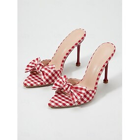 Chic röda och vita ginghamfärgade högklackade mules för kvinnor - eleganta spetsiga sandaler med rosettdetalj &stilettklackar för sommarresortmiddagar, retro trädgårdsfester &picknick chic-stilar