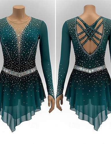 Klänningar till konståkning Dam Skridskor Klänningar Grön Lappverk Asymmetrisk nederkant Elastisk Träning Tävling Skridskoplagg Klassisk Kristall / Strass Stenar Långärmad Skridskoåkning Konståkning