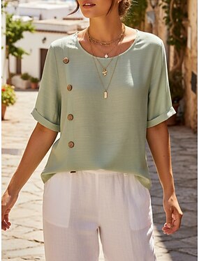 Dam Blus Skjorta i konstlinne Ensfärgat Stylish Ledigt Halvlång ärm Rund hals Vanliga toppar Dagligen Blå Ljusgrön Rodnande Rosa Grön Kaki Sommar Vår