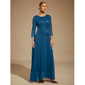 Dam Maxiklänning Chiffongklänningar Elegant Bröllopsgäst Paljetter Spets Ensfärgat 3/4 ärm Rund hals Påfågel-blå