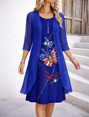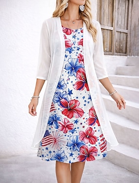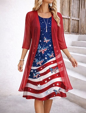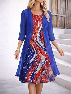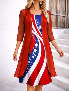 amerikansk självständighetsdag damklänning set a-linjeklänning elegant semester grafisk flagga lager-på-lager-tryck midiklänning halvärmad rund halsringning daglig blå röd mörkblå sommar vår normal