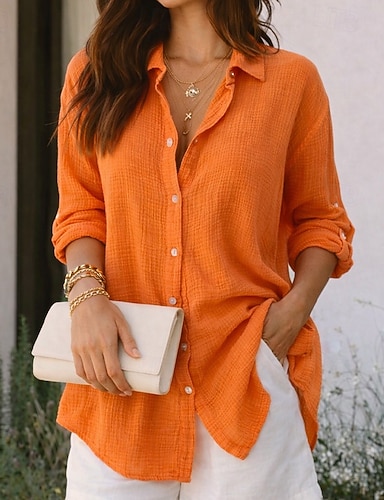 Dam Skjorta Sommarskjorta Casual skjorta Knapp upp skjorta Rynkad Ensfärgat Slät Elegant Semester Mode Långärmad Nedvikt Långa toppar Streetwear Strand Helgdag Orange Sommar Vår Höst