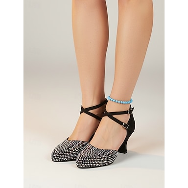Damskor med strass och fotledsrem för ballroomdans med mellanhög klack - professionella latinska övningsskor för Gatsby-fest
