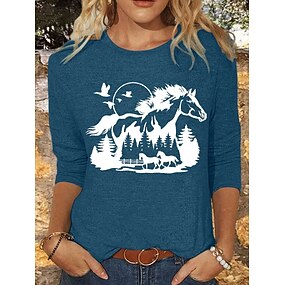 Dam T-shirt Mönster Grafisk Djur Häst Vintage Stylish Klassisk Långärmad Rund hals Vanliga toppar Dagligen Blå Rodnande Rosa Kaki Grå Vår Höst Vinter