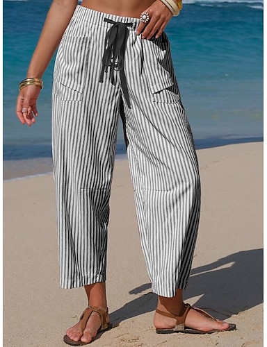 Dam Konstbomullslinne Långbyxor Casual byxor Sommarbyxor Semester Mode Streetwear Ankellång Hög midja Randig Ficka Elastisk midja Bekväm Oelastisk Dagligen Semester Dagliga kläder Blå Svart Rodnande