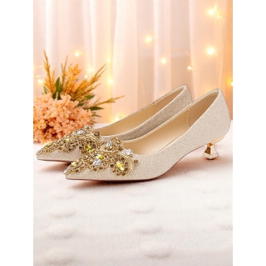 Damskor med låg klack och spetsiga guldglitter och strass &ädelstensutsmyckningar, eleganta finskor för fester, bröllop &formella evenemang
