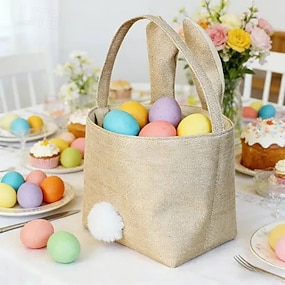 2-pack påskhare-korg i tyg med långa öron och pompomsvans, tygkasse för påskäggjakt för barn, återanvändbar presentpåse i säckväv för godis och festgåvor, söt påskkorg med kanintema
