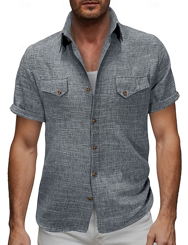 Herr Skjorta Linneskjorta Knapp upp skjorta Slät Semester Gata Svart Vit Kaki Mörkgrå Kortärmad Tröjkrage Sommar Vår Kläder Ficka