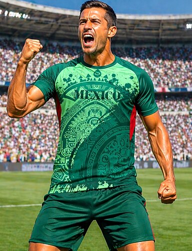 herr fotbollströja aztekisk grafisk stil mexikansk inspirerad atletisk sommar kortärmad t-shirt upf 50 snabbtorkande andningsbar 2026 fotbollsfan-tröja turnering fotboll gym löpning sport grön