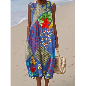 Kvinnors Midi Klänning Linnen Liknande Sommarklänning Skift Klänning A-Linje Klänning Semester Casual Boho Strand Fest Gå Ut Regular Fit Blommig Grafisk Ärmlös Crewneck Blå Sommar Vår