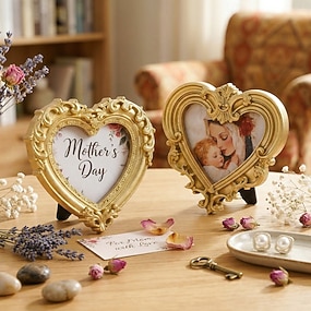 Hjärtformad fotoram i präglad harts med guldfärgad krämfärg – varm heminredning för familjefoton &fotograferingsrekvisita